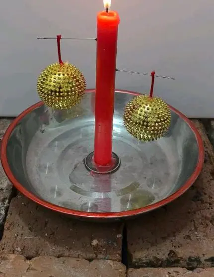 在盘香的特定位置上装上几个金属球,盘香下面放一个金属盘,当燃烧到某一特定的部位时,金属球就会落在金属盘里,发出清脆的响声。